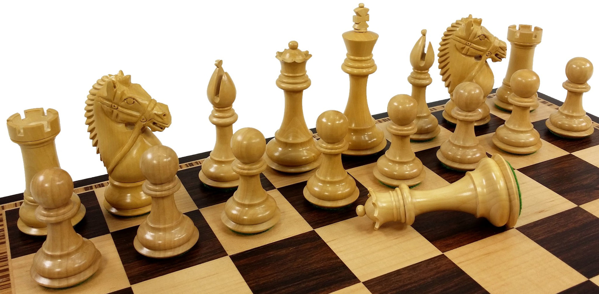This listing is for a brand new 34pc (includes 1 set of extra queens) set of staunton style chess men in the giant bridled king design. Pieces are Acacia and boxwood with felt bottoms.