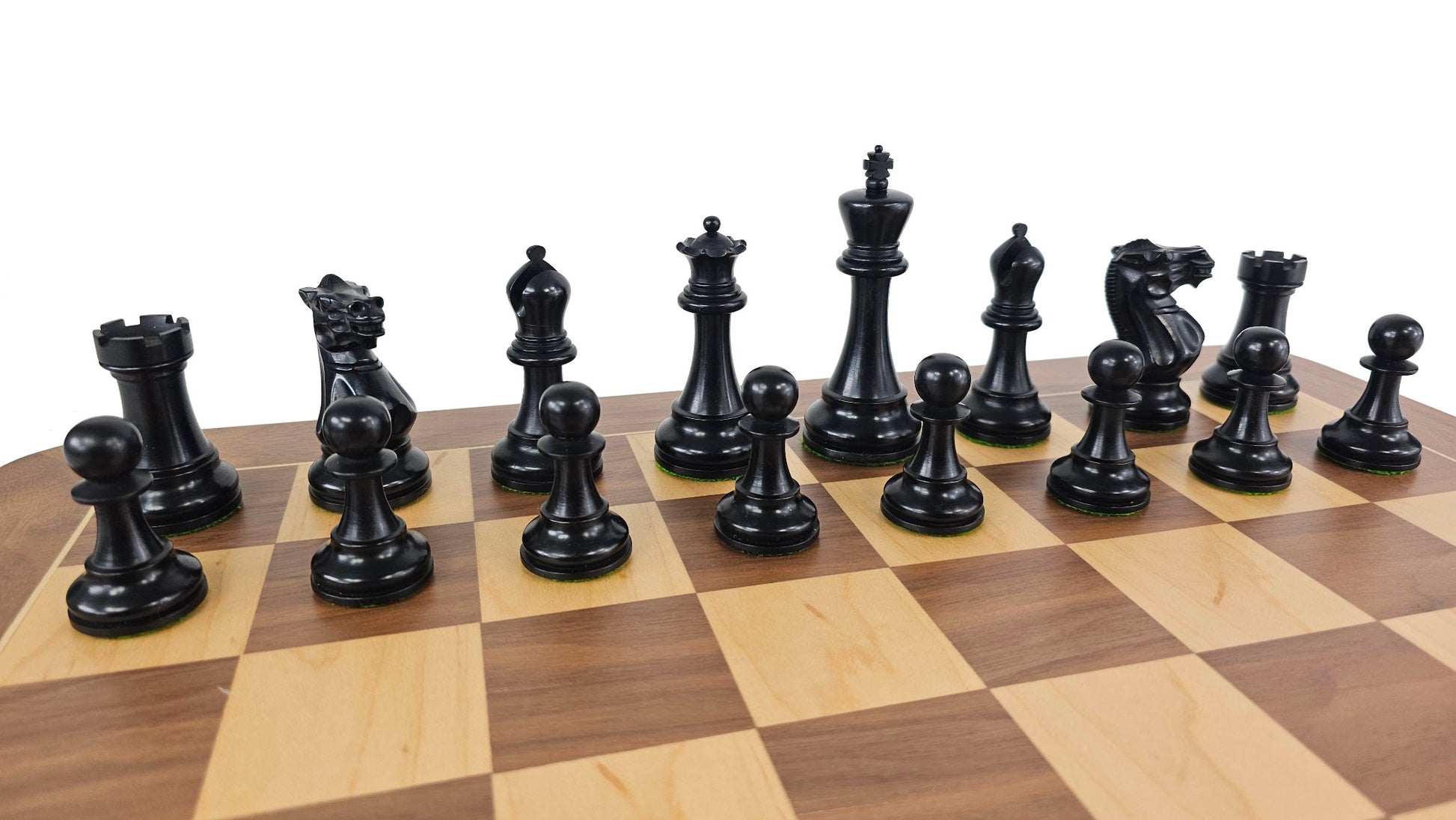 4 QNS Black / Antiqued 3 3/4" Anderssen Staunton Wood Chess Set 19" Walnut Board