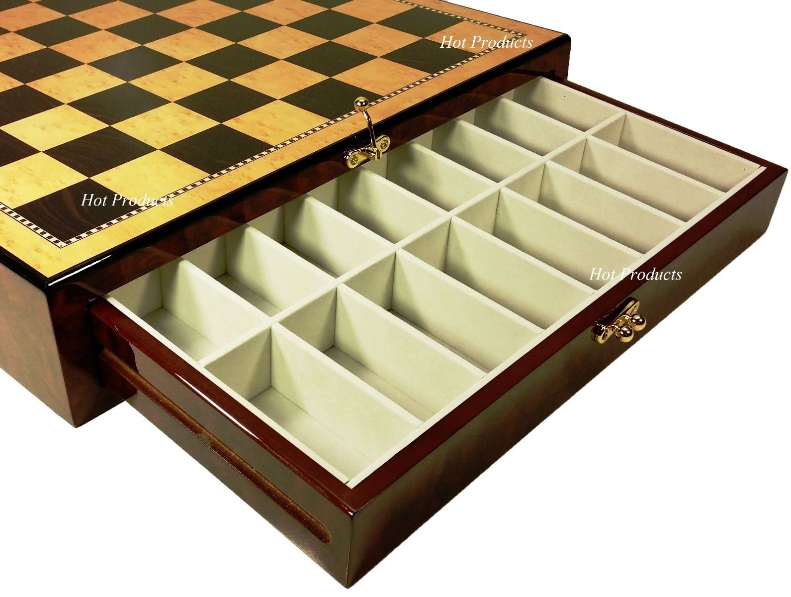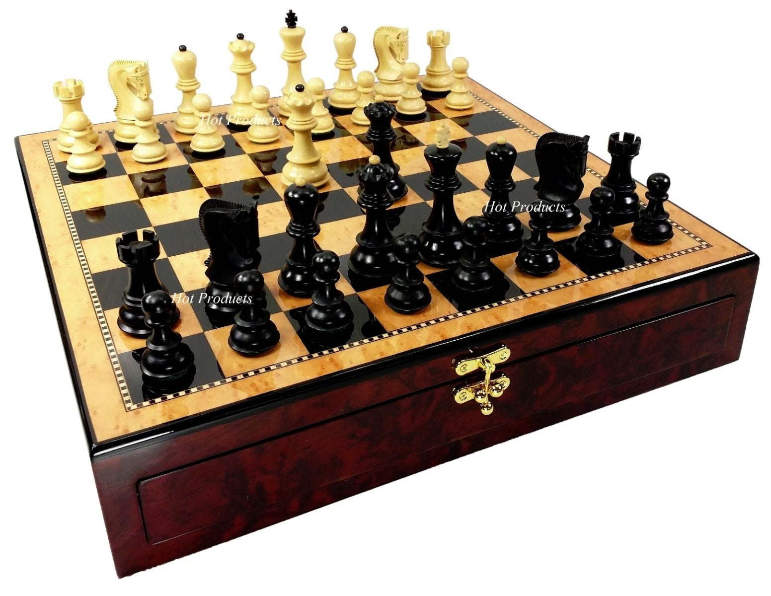 This listing is for a brand new 32 piece set of staunton style wood chess men with opposite tops. High Gloss storage board included. Chess men are Boxwood, double weighted and felted. Board features an artificial high gloss Walnut and Birdseye Maple color laminate over mdf wood. Bottom is fully felted and has 1 drawer on each side.