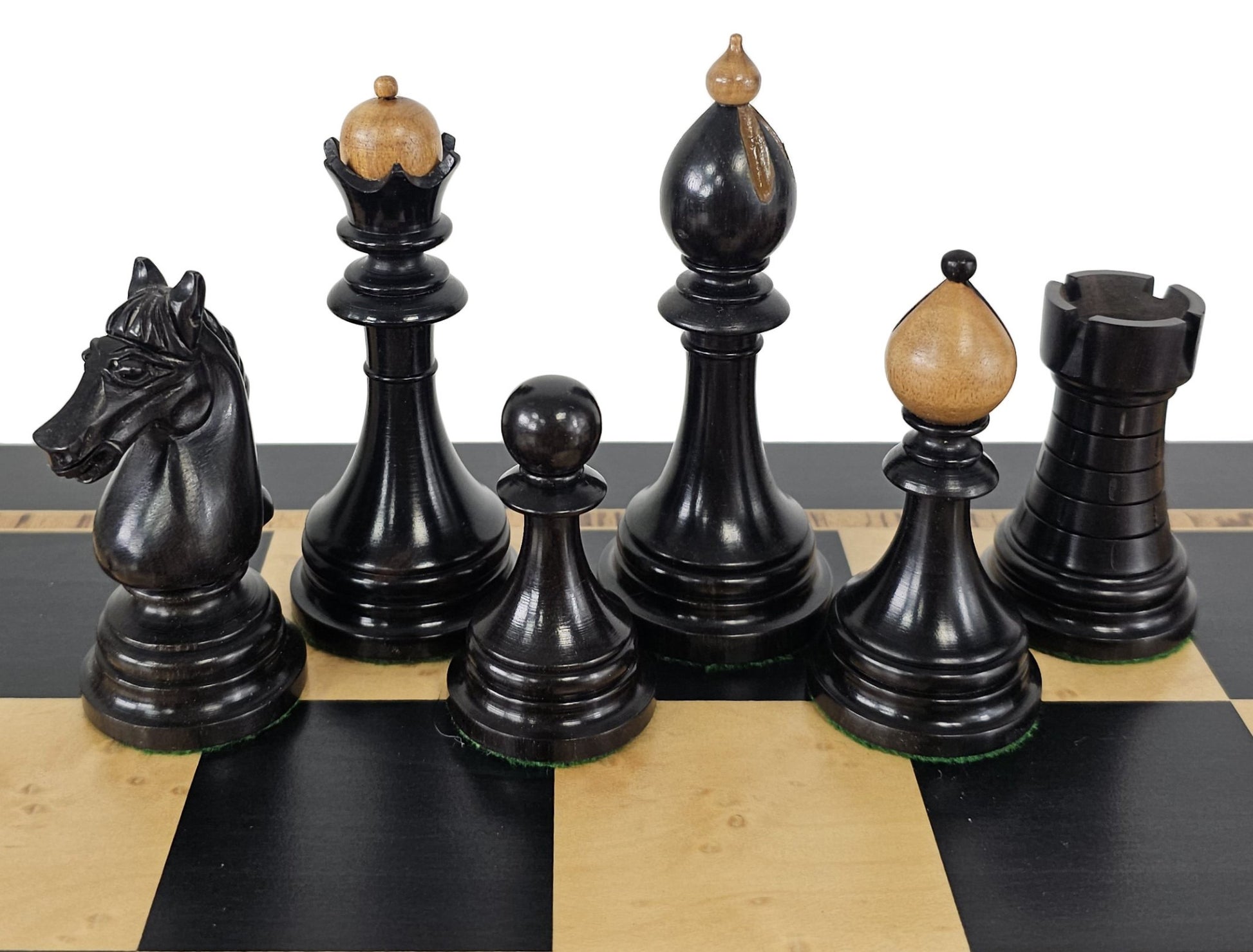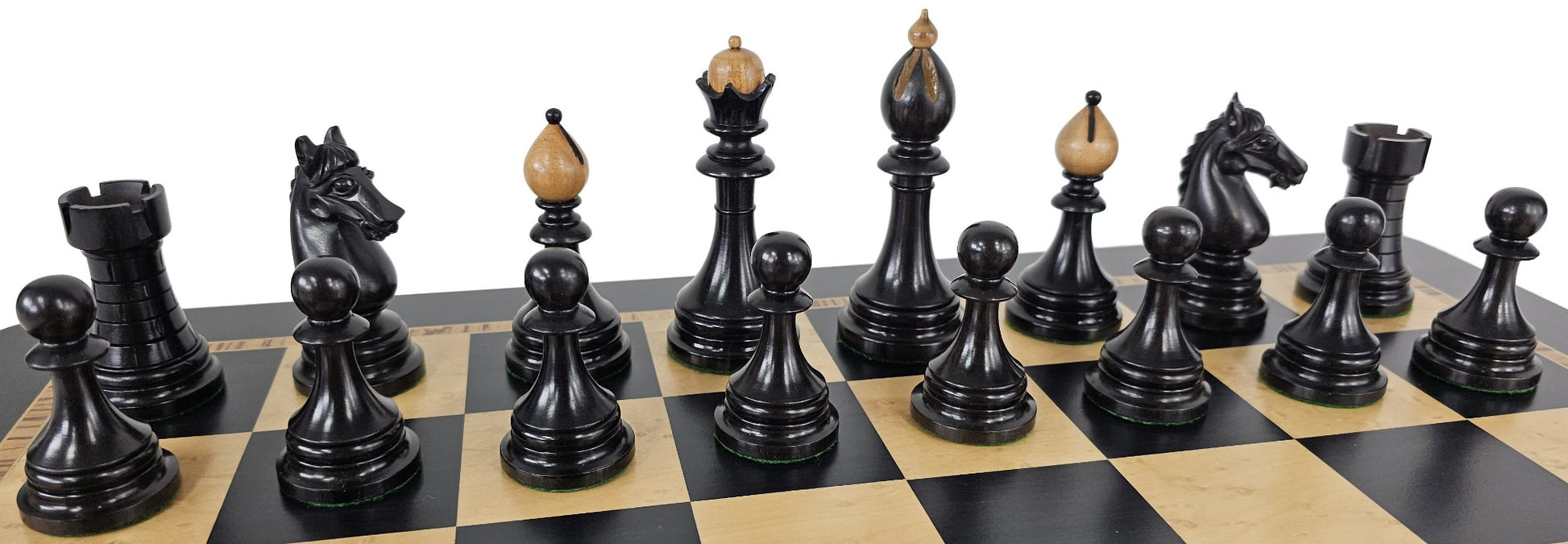 This listing is for a brand new 34 piece (includes 1 set of extra queens) set of Luxury staunton chess men pieces with board (NO storage). Pieces are constructed out of Ebony and Boxwood with felt bottoms. Board features genuine Ebony and Birdseye Maple Wood veneers over solid mdf wood core.