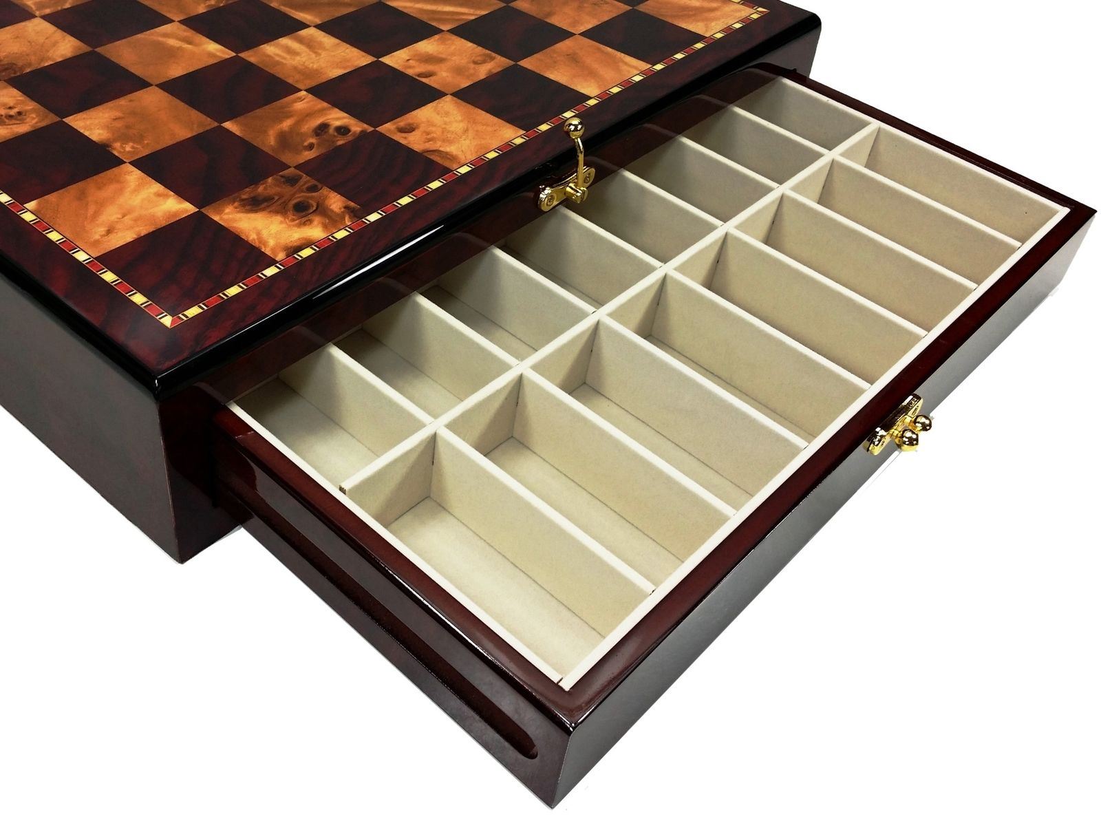 Board features a beautiful high gloss artificial Cherry and Burlwood color laminate over mdf wood. Bottom of board is fully felted. Great looking set!