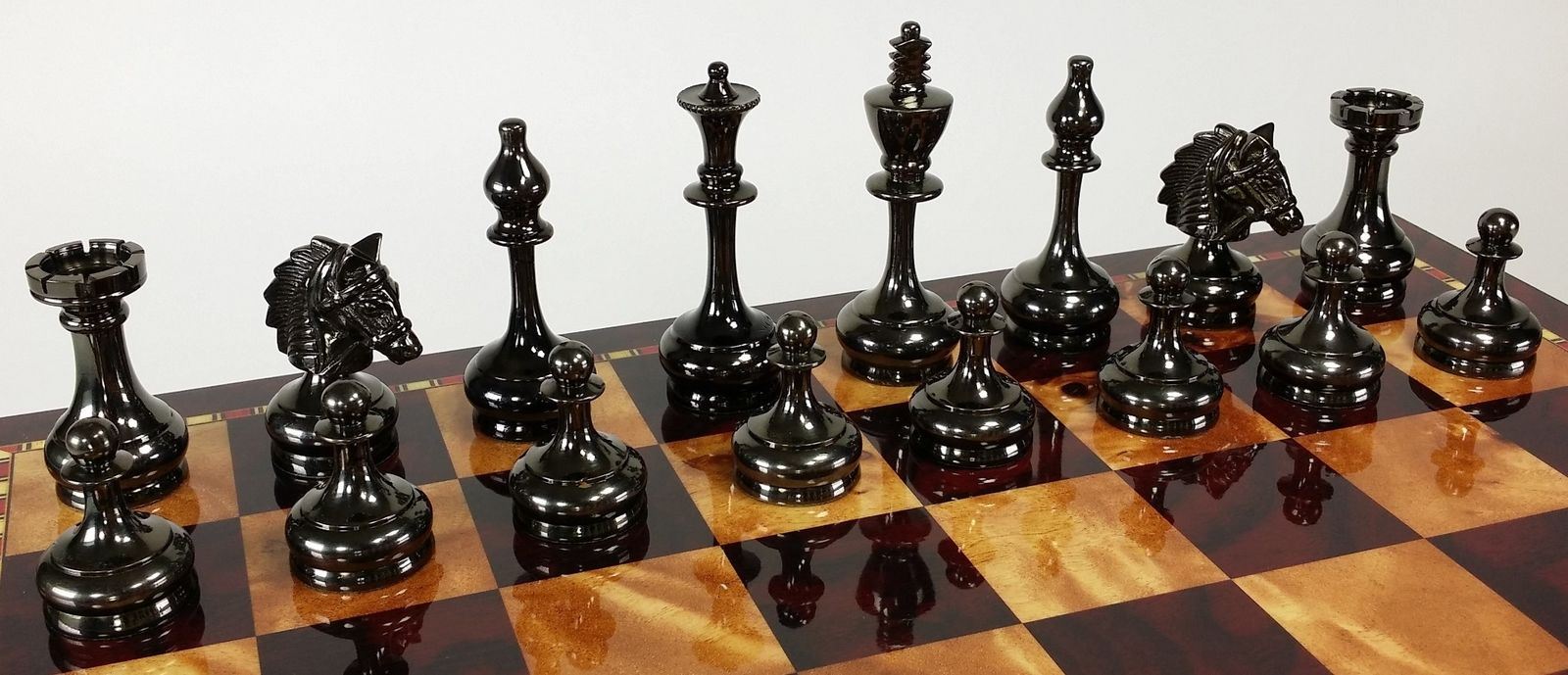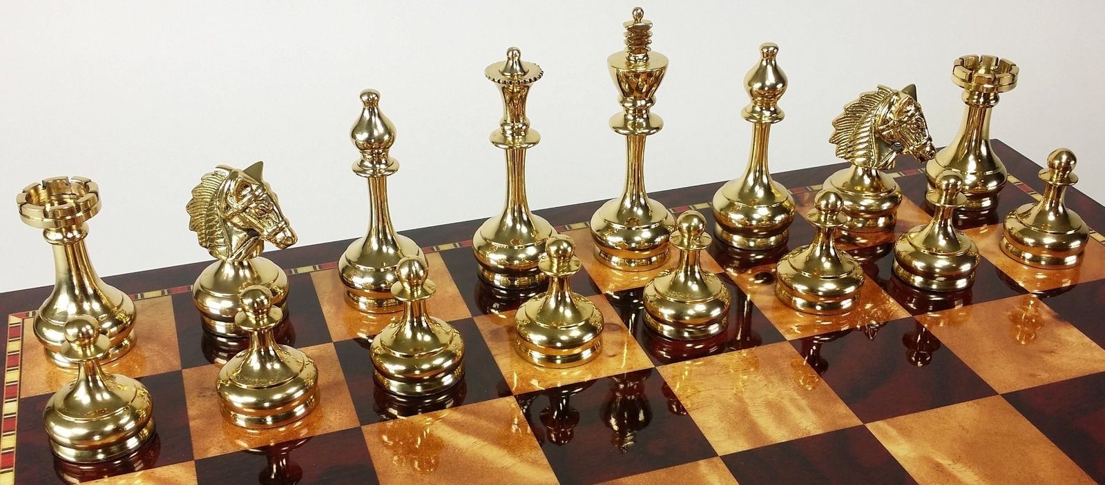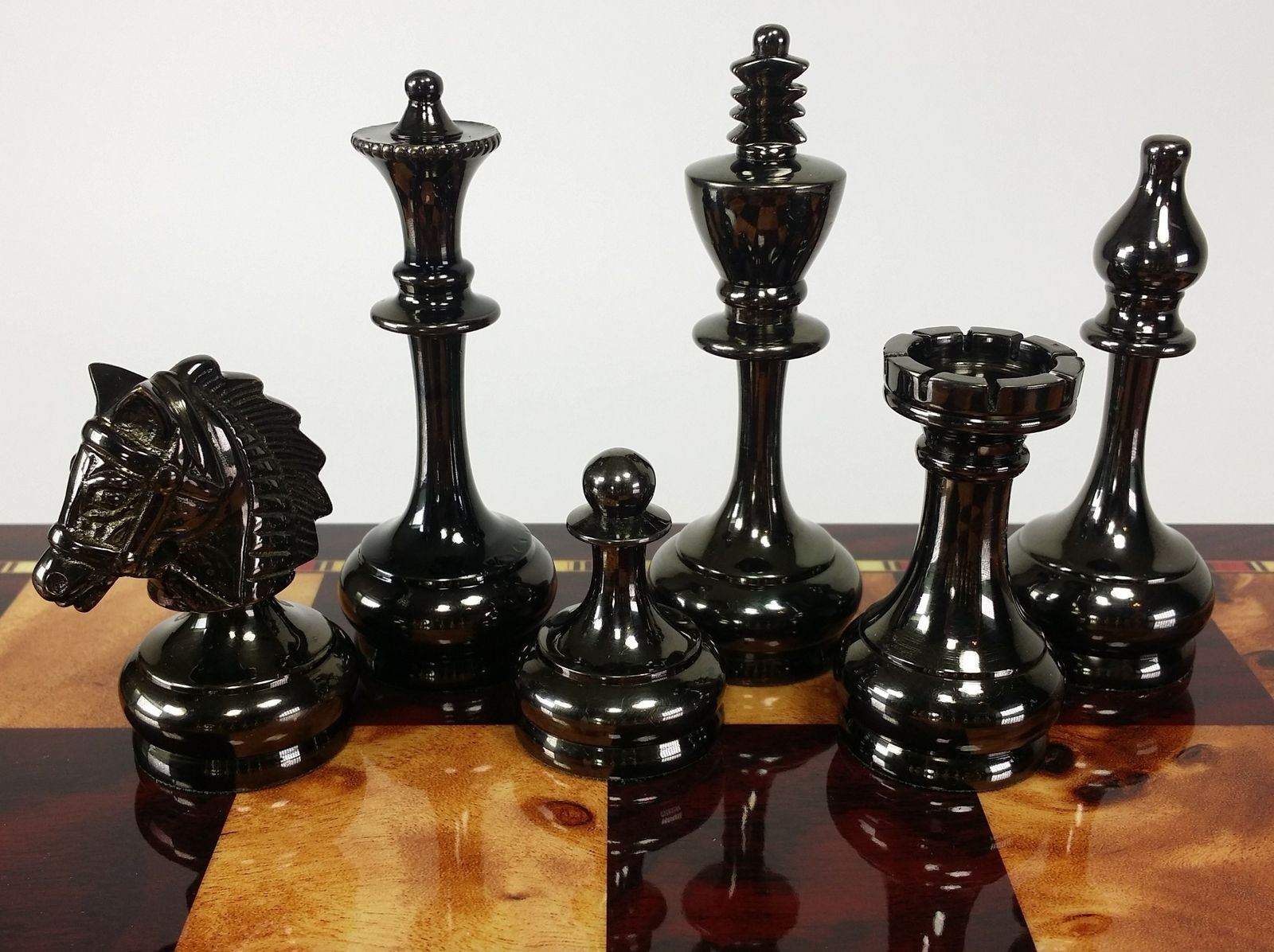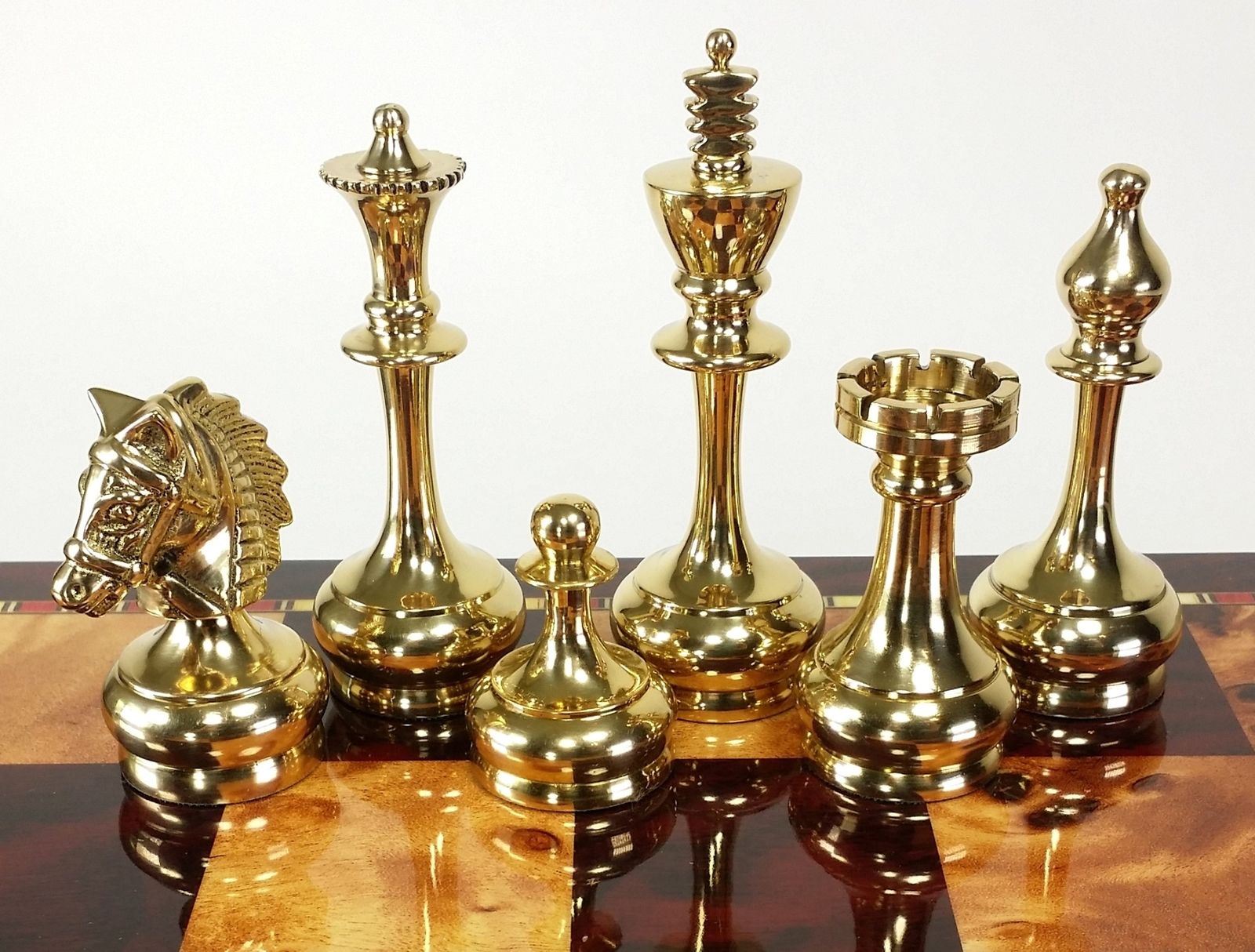 This listing is for a brand new 32 piece set of real brass chess men with storage board Men feature a black chrome and gold color plated finish.
