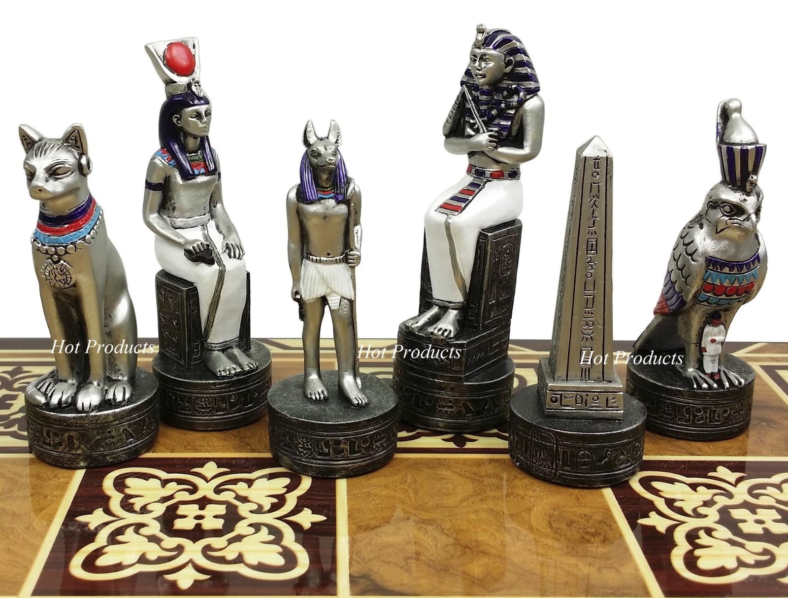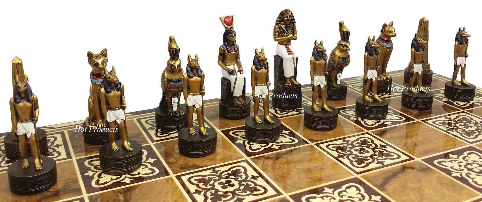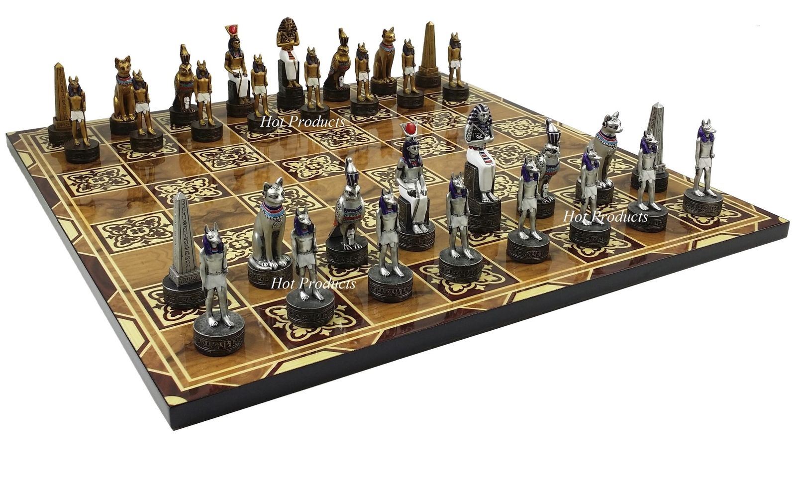 Egyptian Anubis Chess Set Gold & Silver Painted Men 17" Burlwood Color Board