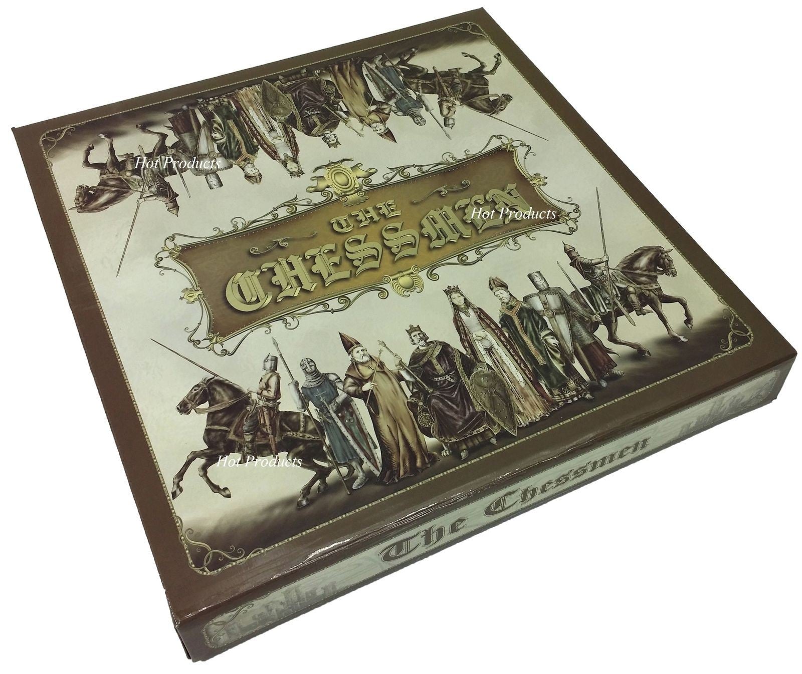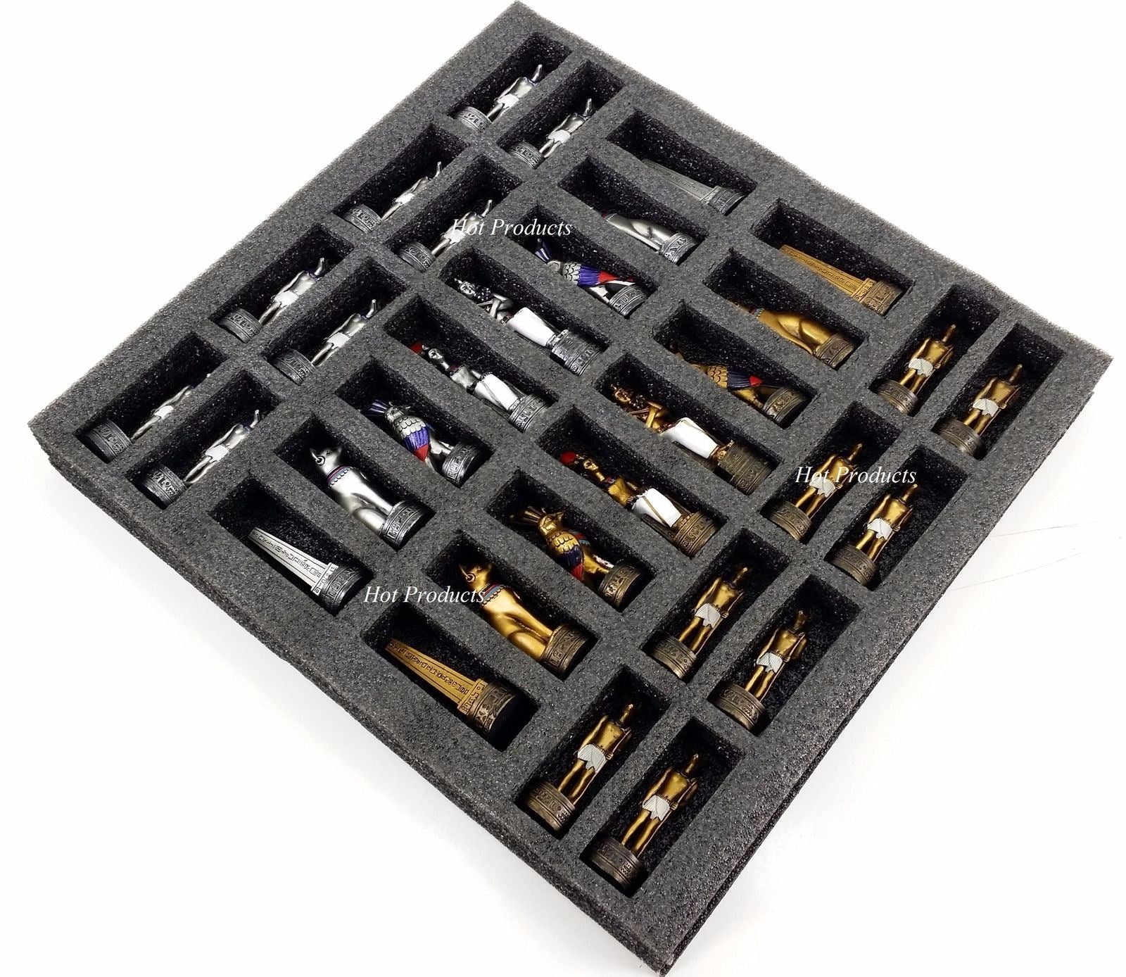 This listing is for a brand new 32 piece set of hand painted chess men with Board. Pieces are constructed out of solid resin, hand painted and have felt bottoms. Board features an laminate over mdf wood