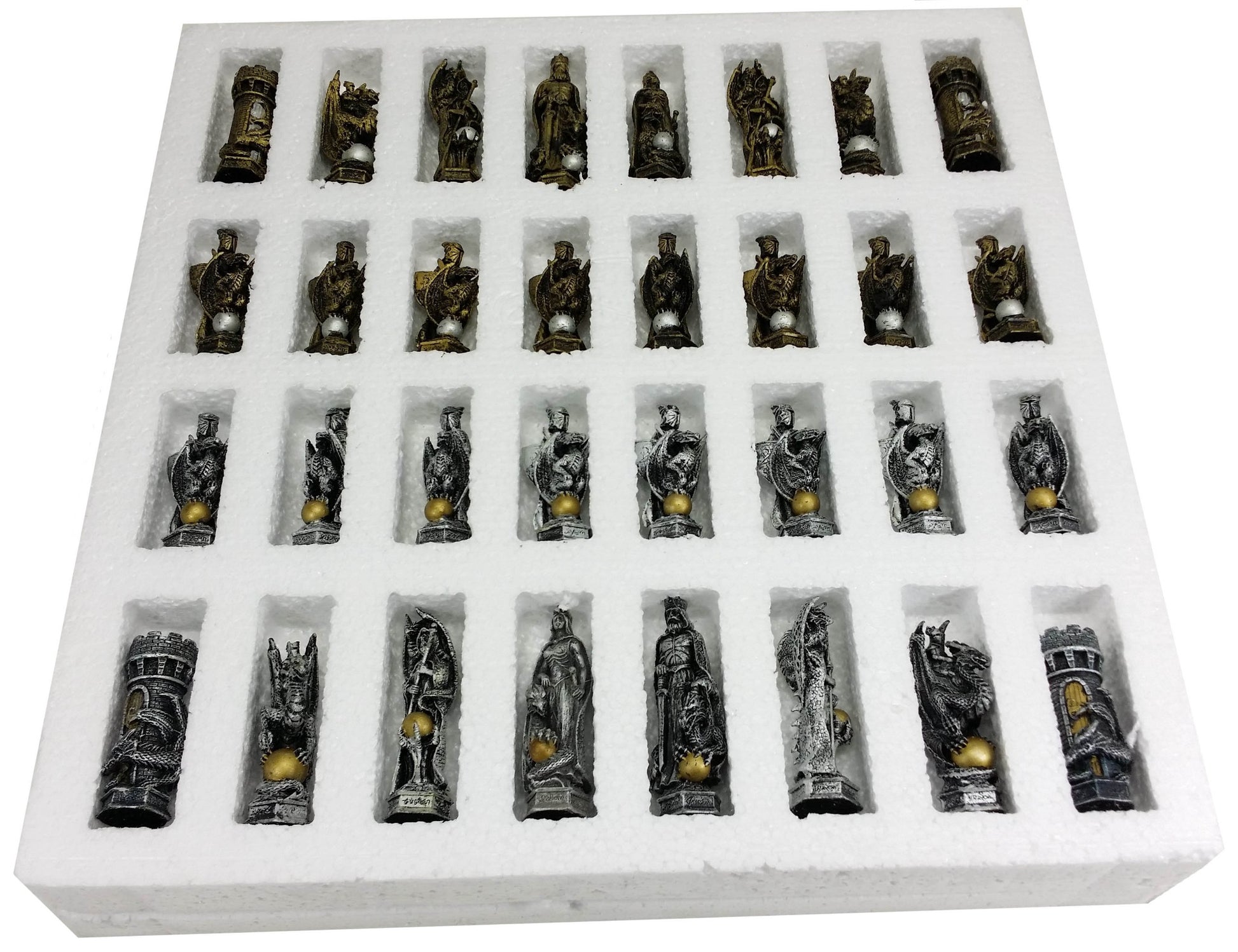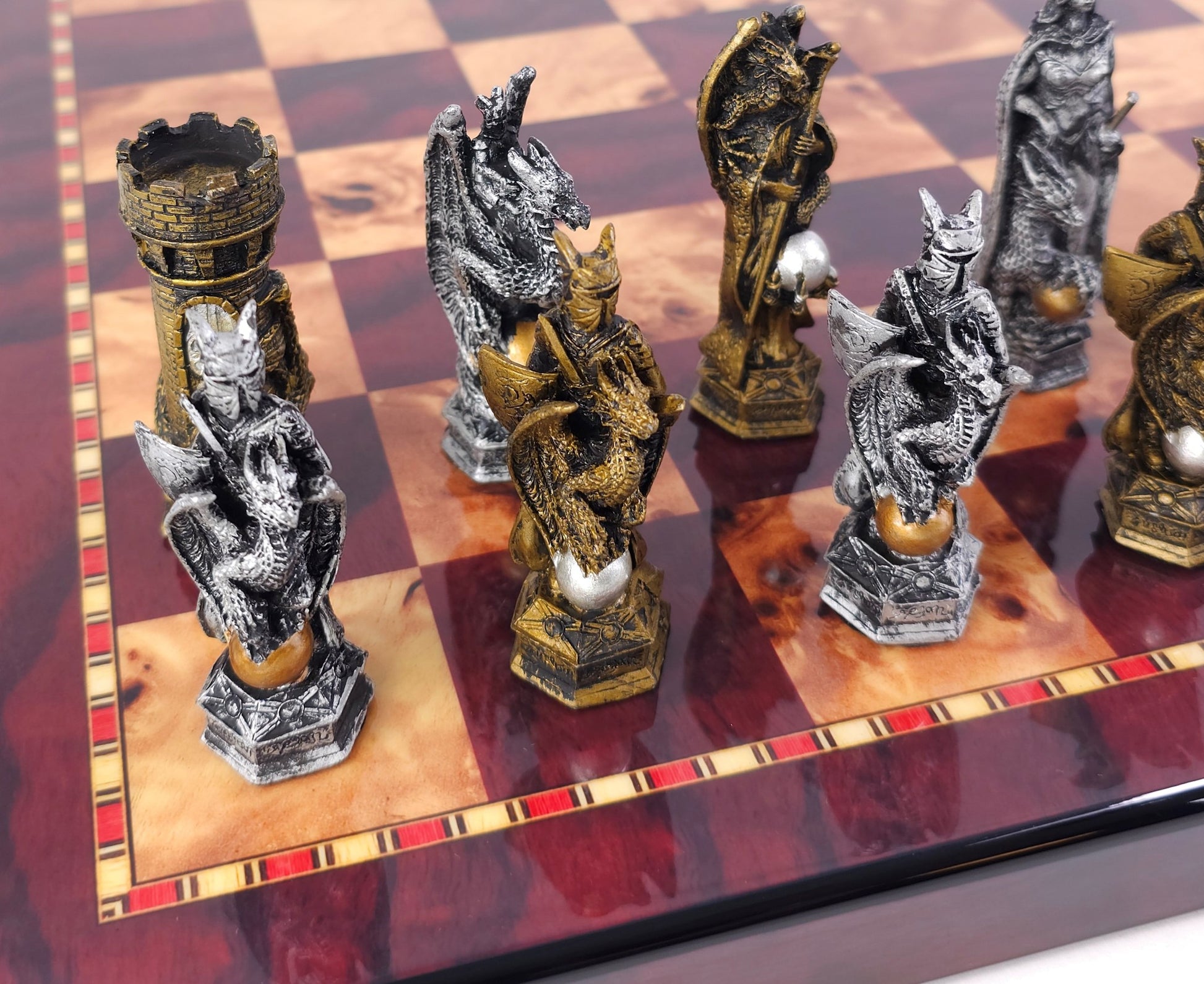 King Arthur Dragon Medieval Times Chess Men Set with 18" Cherry Color Board