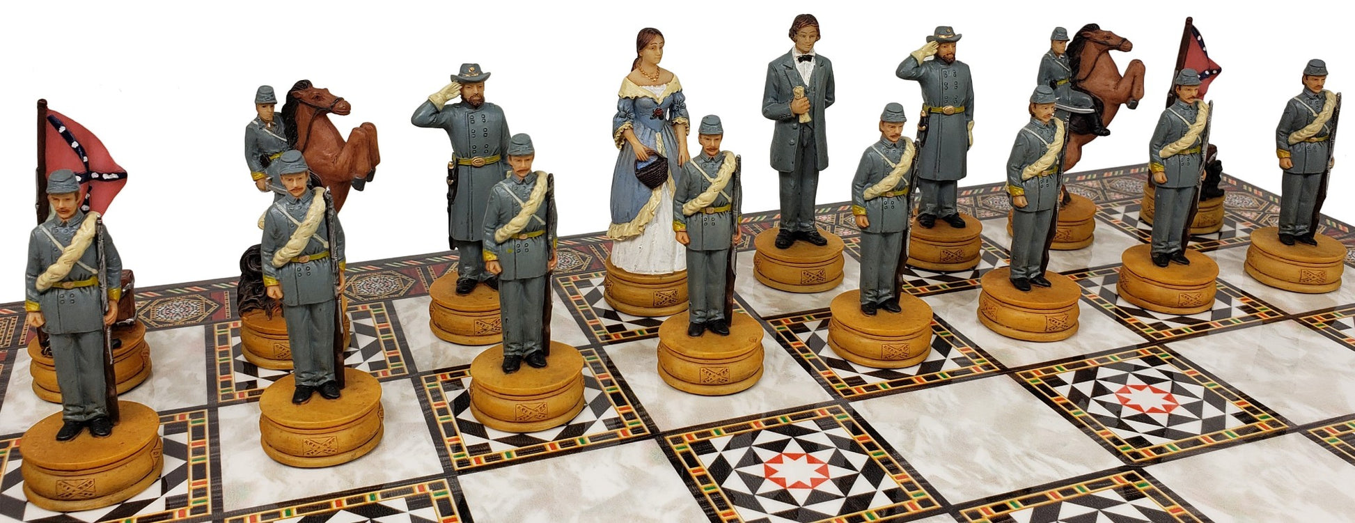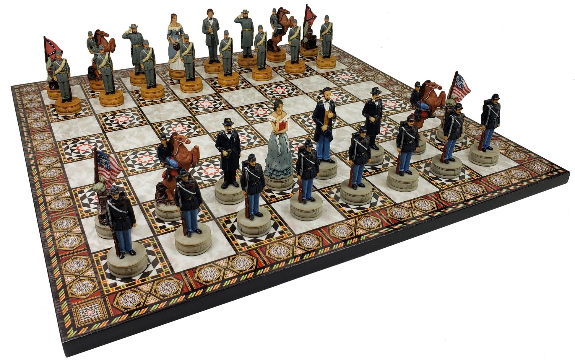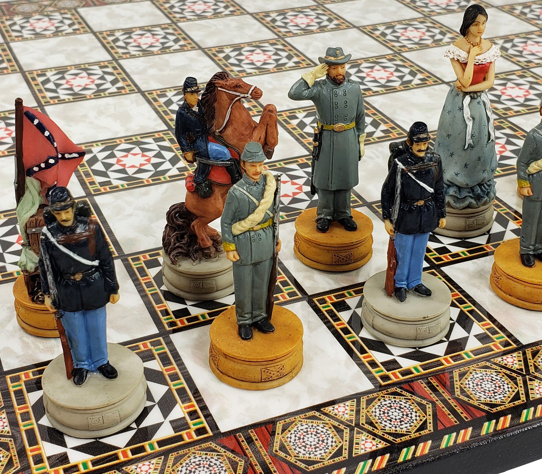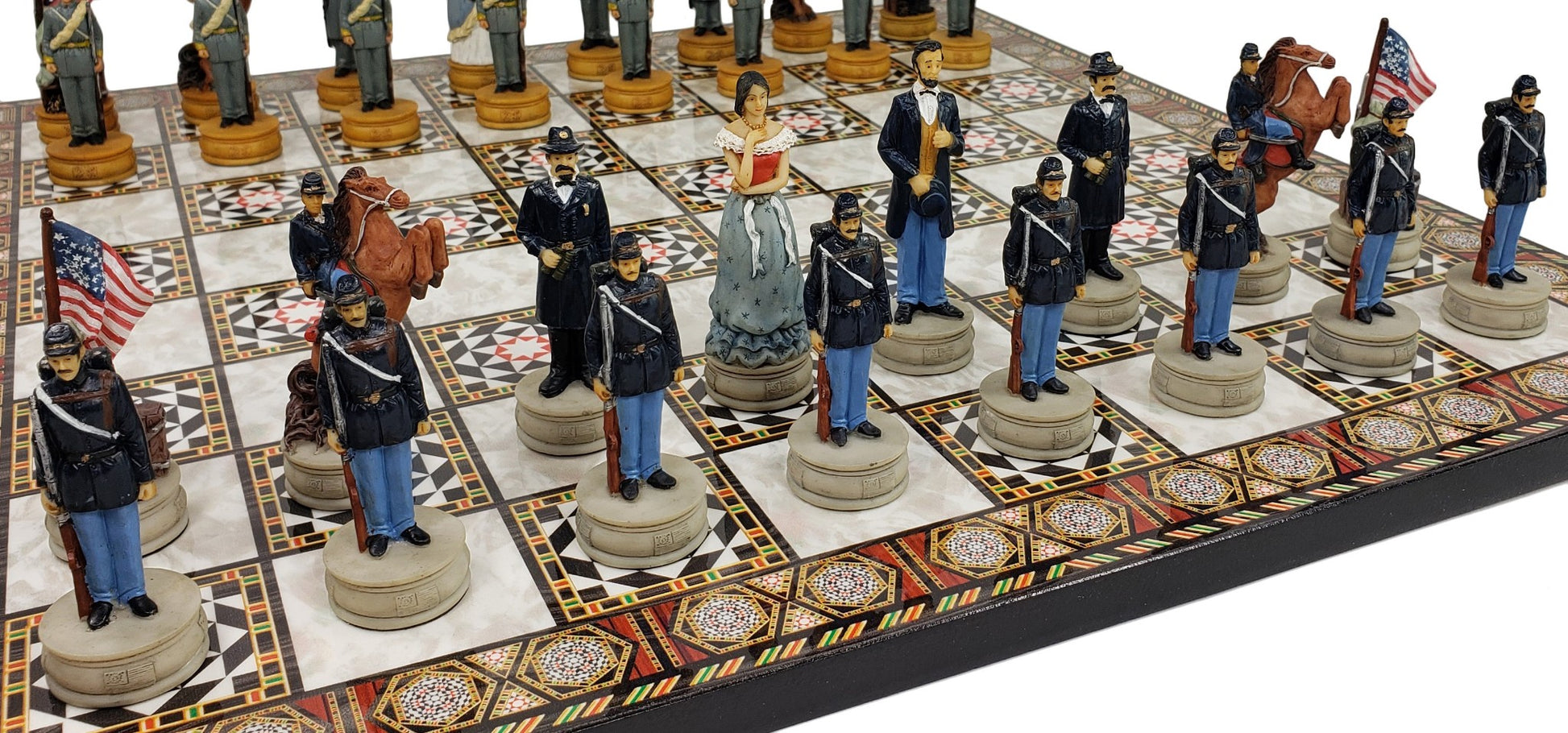 US American Civil War Wife Queens Painted Chess Set with 17" Mosaic Color Board